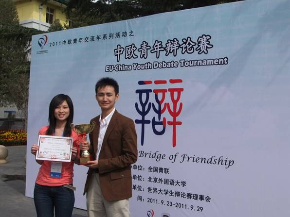 此次辩论赛,来自欧洲的16支代表队与16支中国代表队的大学生同场竞技。辩论语言为英语,在英国议会制辩论形式基础上,辩论队伍采用一名中方辩手搭配一名欧洲辩手的方式进行。此前,在今年6月举行的中欧青年辩论赛全国选拔赛中,高天与王尼娜同学搭档,获得全国季军。